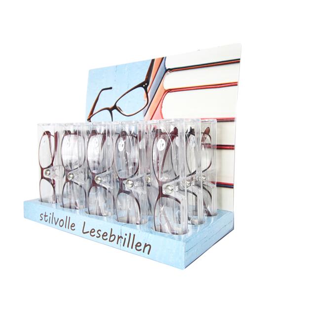 15 Lesebrillen inkl. verschließbaren Etuis und Verkaufsaufsteller